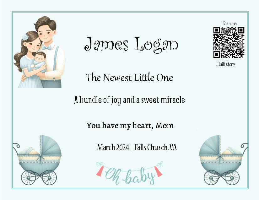 Step-by-step instructions for completing your quilt’s story will be emailed when your label is shipped. Your Quilt’s Story is private and accessible only by its QR code.